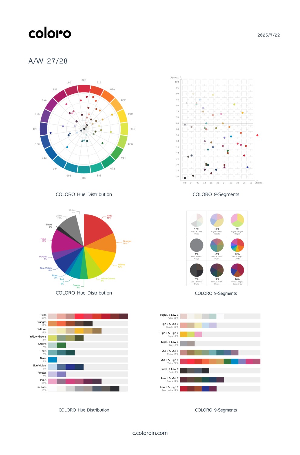 В сезоне A/W 27/28 разнообразная палитра цветов по-прежнему равномерно распределена по цветовому кругу, при этом в этом сезоне больше оттенков приходится на пурпурные и тиловые цвета.